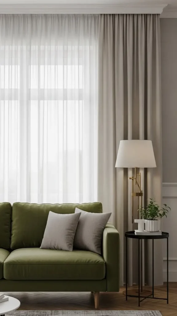 Light curtains frame the couch gently. Linen or cotton fabrics work well.