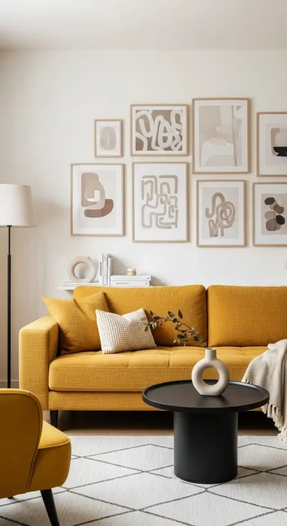 Pair a mustard yellow sofa with beige, cream, or soft gray walls to let the color shine while keeping the space calm and balanced.