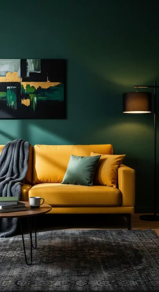 Deep green, charcoal, or navy walls create a dramatic backdrop that makes mustard pop beautifully.