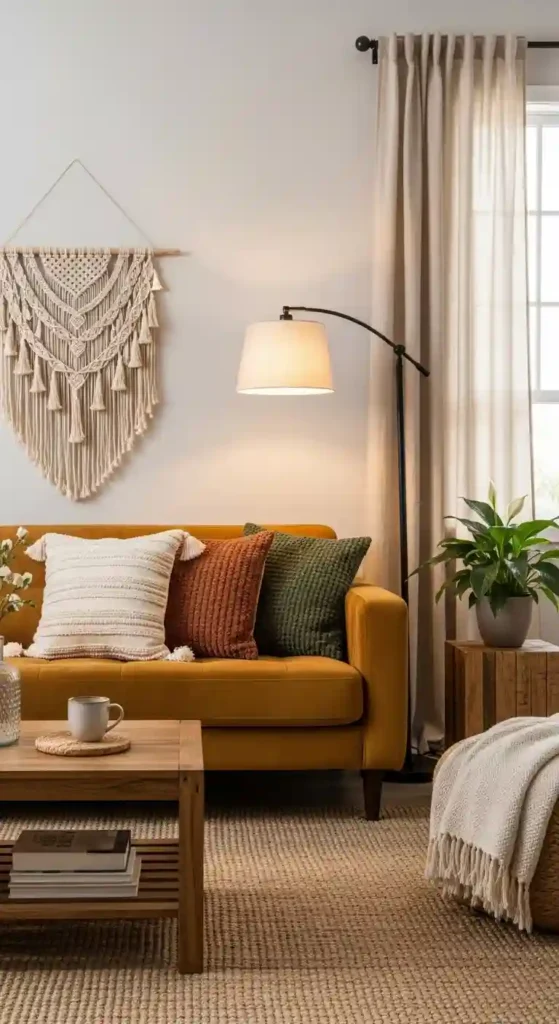 Mix warm lighting, natural textures, and neutral decor to create a harmonious living room centered around your mustard sofa.