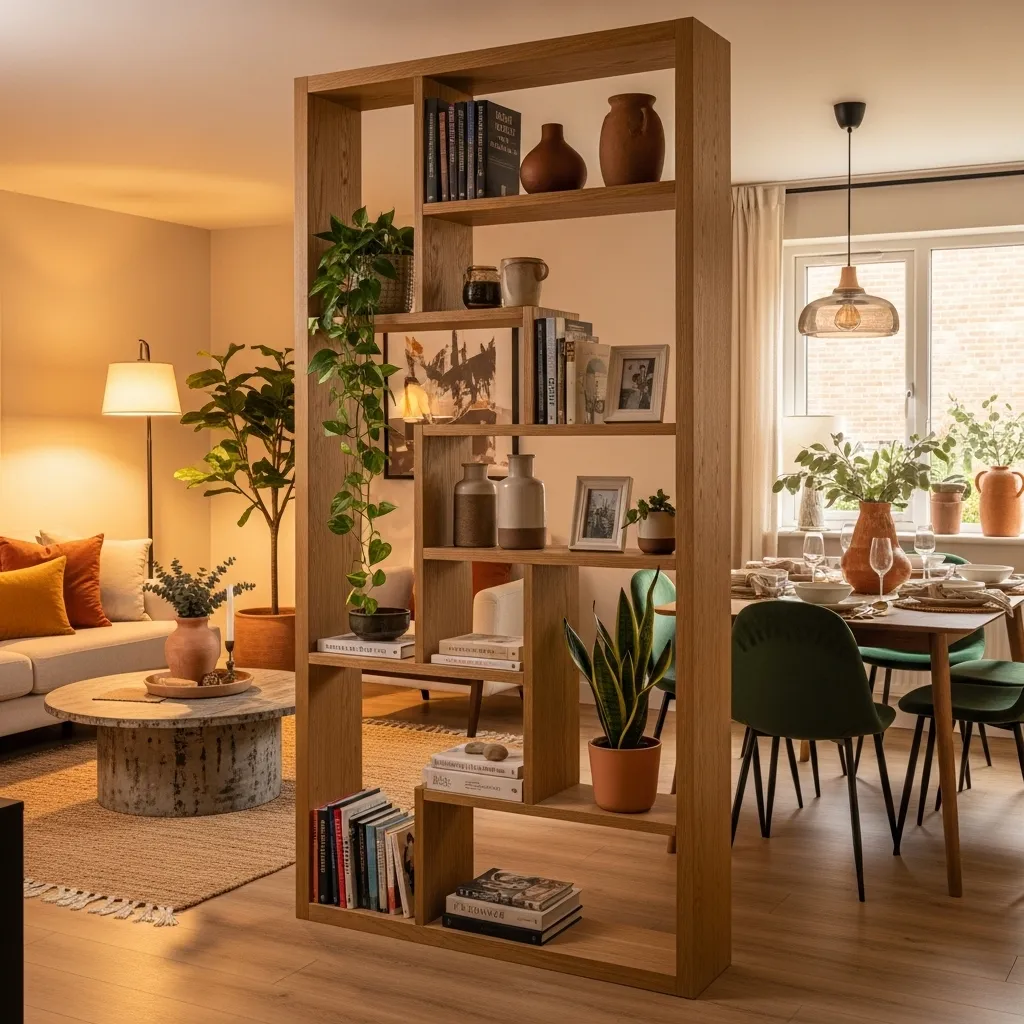 Decorate the shelves with baskets, pottery, and DIY ornaments to bring texture and charm. The living area feels enclosed but not boxed in, while the dining space gains a more intimate feel. This layout is perfect for readers and décor lovers alike.