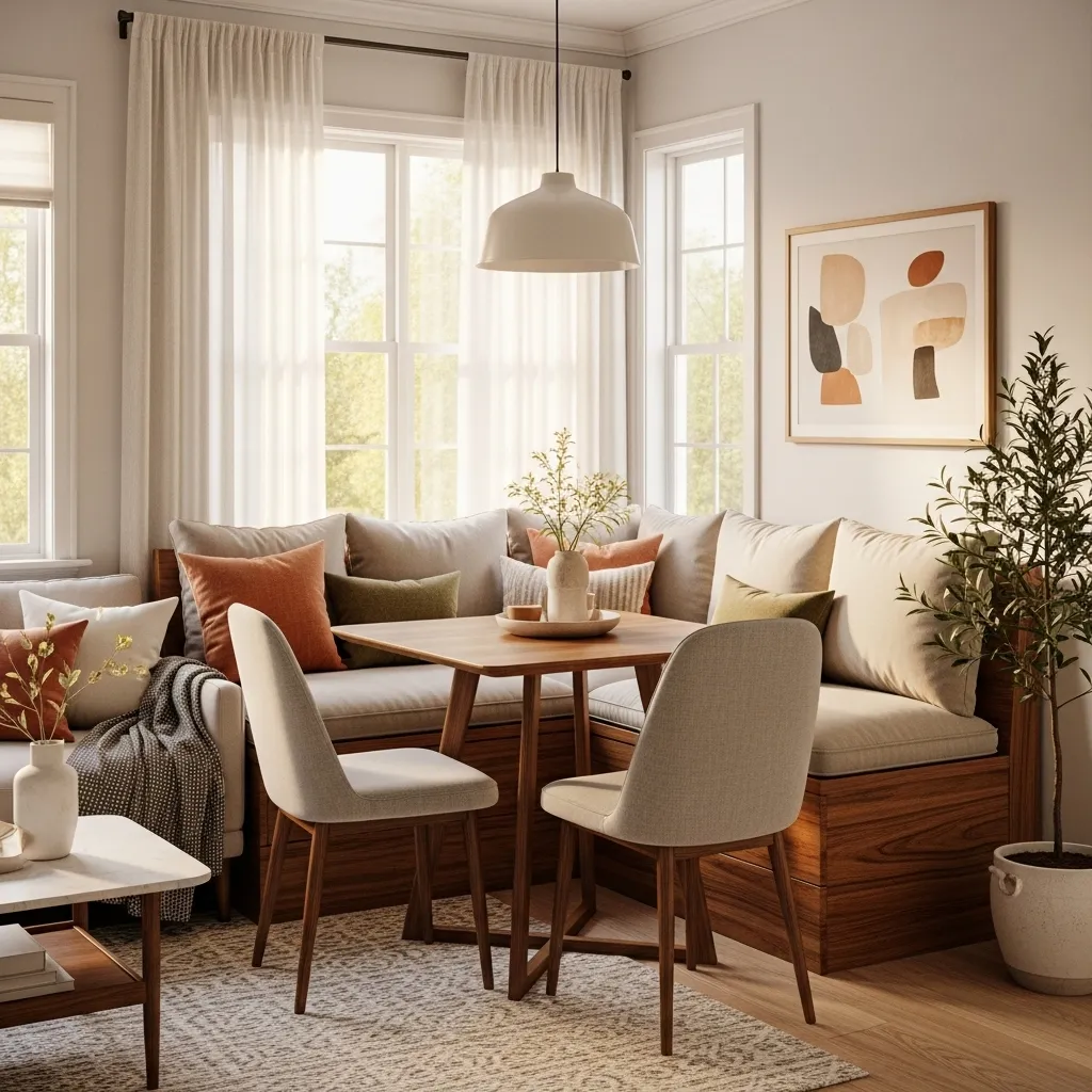 A corner banquette is a game-changer for tiny living–dining combos because it uses every inch without crowding the space. Add cushioned benches along two walls, forming a cozy nook perfect for meals or coffee moments. Soft pillows, warm fabrics, and handmade decor instantly infuse comfort. This layout also opens up the center of the room, making movement easy and keeping the visual flow clean and light.