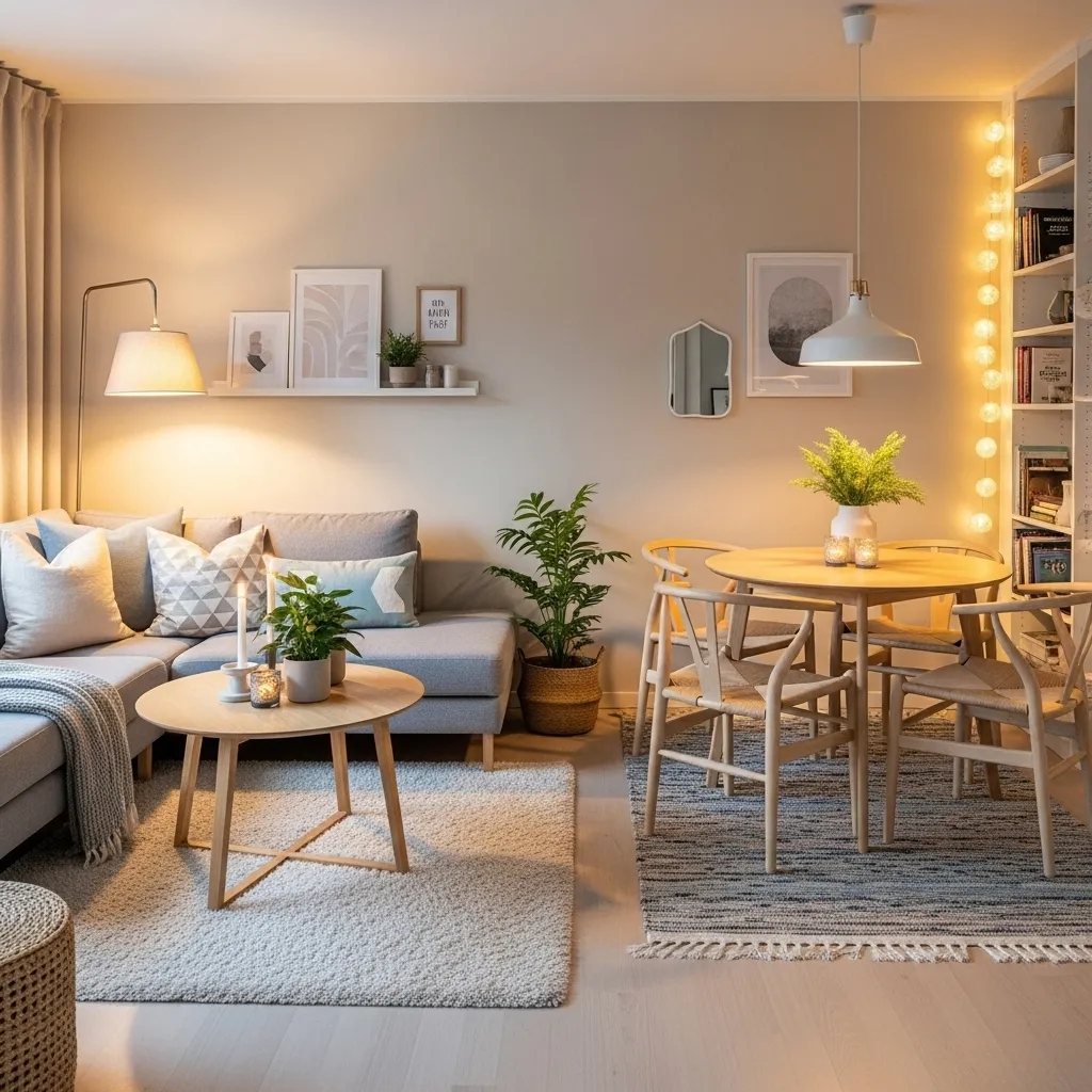 Scandinavian design is perfect for small spaces because it blends simplicity with warmth. Use light woods, neutral fabrics, and minimal decor to divide the living and dining zones naturally. The calm palette helps the room feel open and airy, while textures—like knitted throws and woven baskets—add cozy charm.