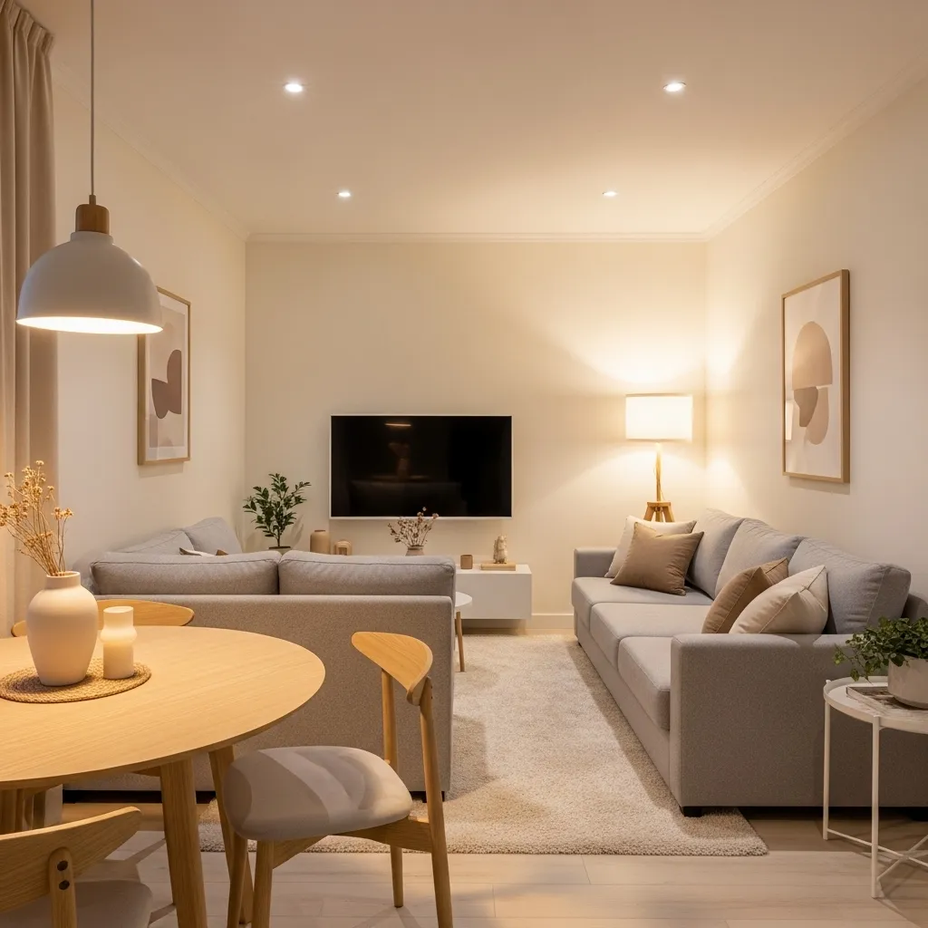 Integrating storage-friendly furniture is essential for small homes. Use a storage ottoman as a coffee table, a storage bench as dining seating, and open shelving to keep essentials organized. This layout ensures your space stays tidy, functional, and beautifully styled. Add warm lighting, cozy fabrics, and soft textures to soften the look and bring warmth.