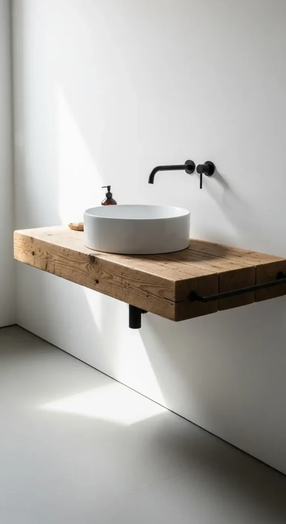 A simple wall-mounted wooden vanity made from plywood or reclaimed wood creates a modern, minimalist look. Floating designs save space, reduce material costs, and make small bathrooms feel larger.