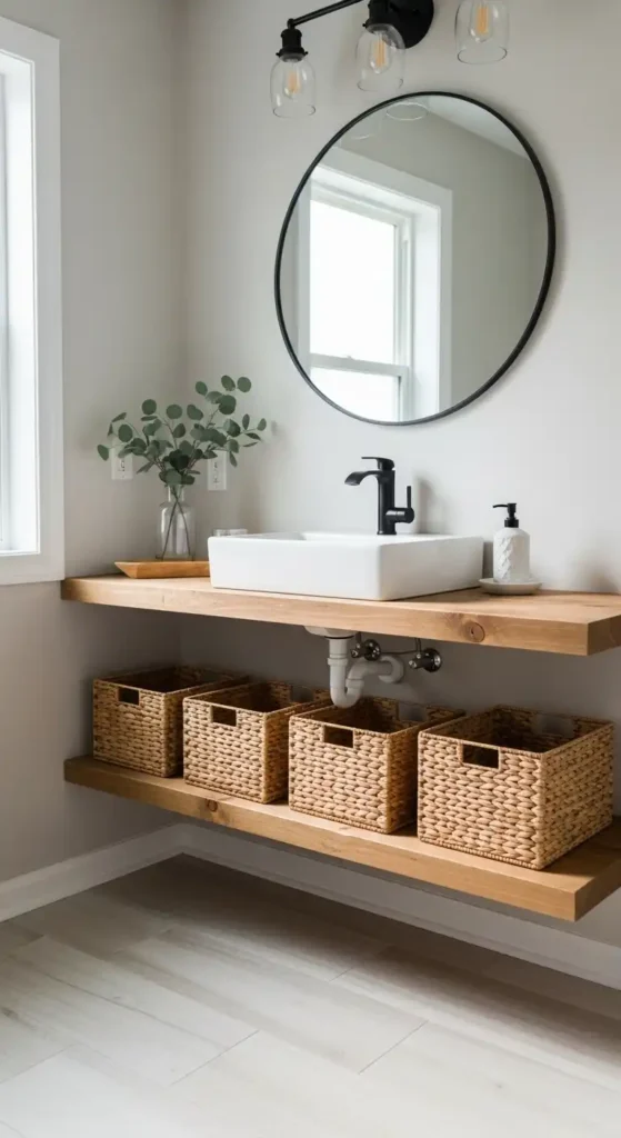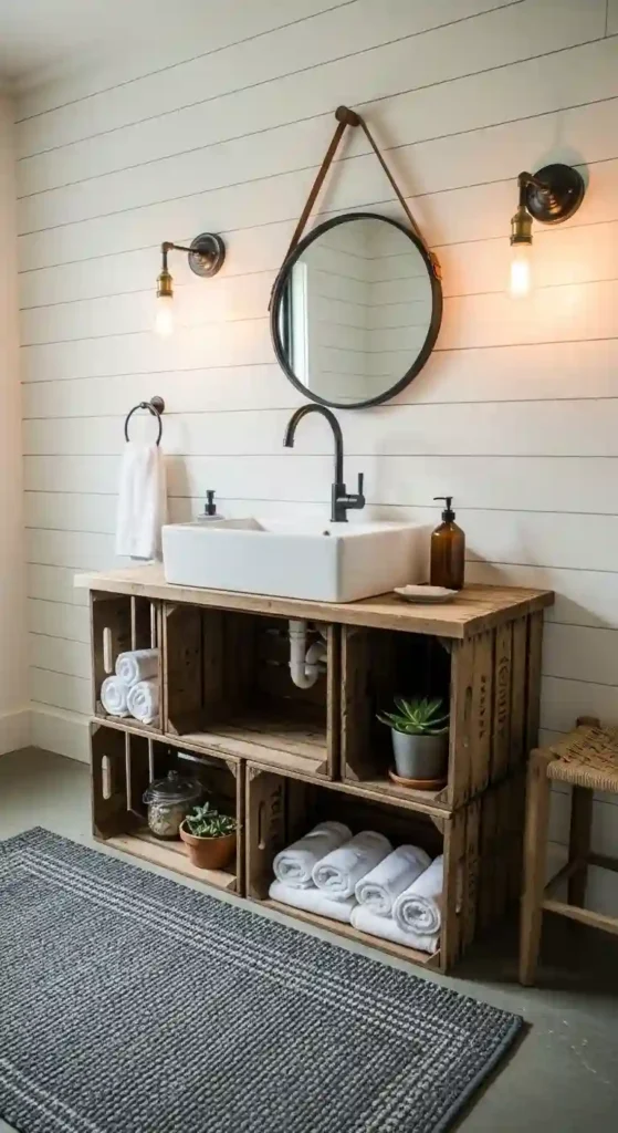 Wooden crates or storage boxes can be stacked or framed to form a unique vanity base. This idea is perfect for rustic, farmhouse, or industrial bathrooms and works well for tight budgets.