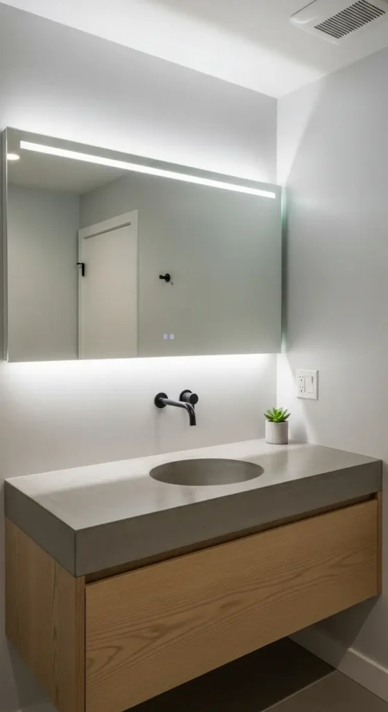 Pouring a small concrete countertop over a basic wooden base creates a high-end look for less. Concrete is affordable, durable, and gives your vanity a modern, custom appearance.
