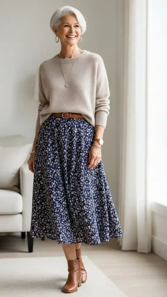 Wearing skirts at 60+ looks most flattering when balanced with structured tops. Soft blouses, tailored shirts, or light blazers add shape and prevent outfits from appearing loose or shapeless. This contrast helps define your silhouette naturally.
