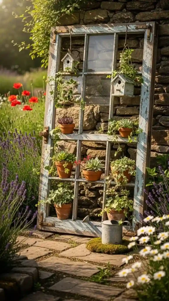 Old window frames add vintage elegance when leaned against fences or walls. Chipped paint and aged wood enhance their beauty.